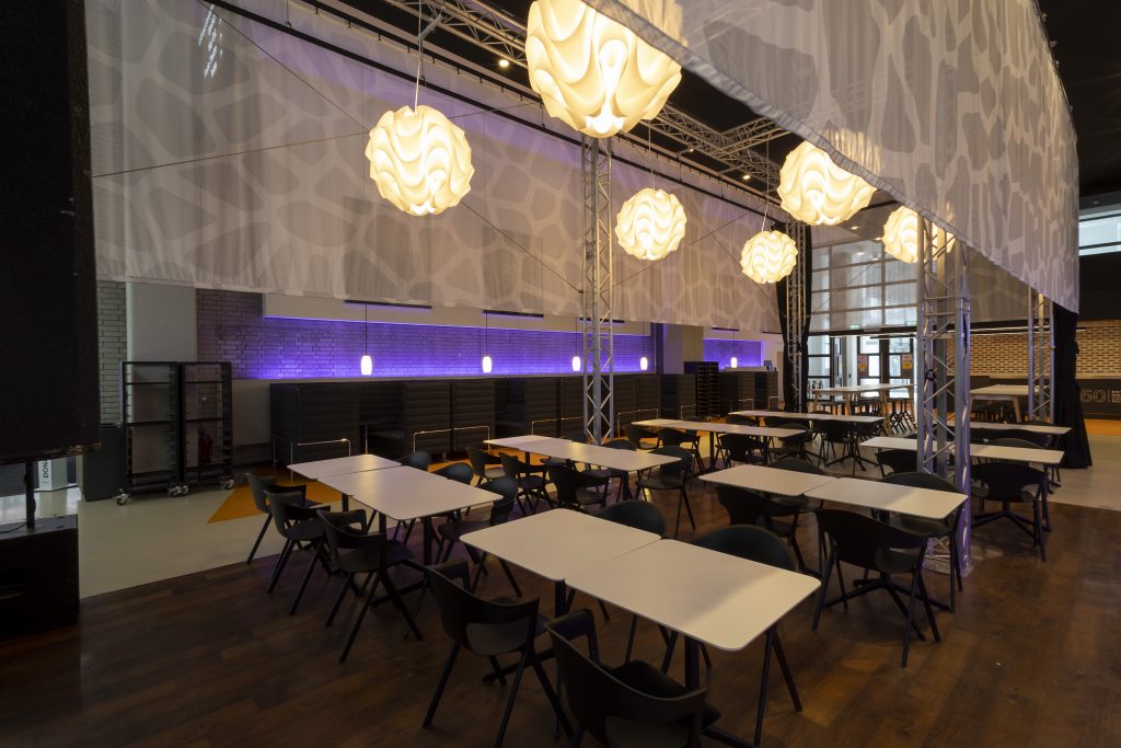 The Student Space is not your typical dining hall; it caters to students and visitors during the day and transforms into an entertainment and events venue in the evening. To infuse a more dramatic ambiance, the college sought a truss structure that would encompass the area with curtains, lighting and sound.